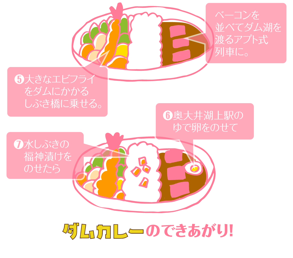 大井川鐵道のアプト式列車、そして人気スポットの奥大井湖上駅を再現した人気のメニューです。
